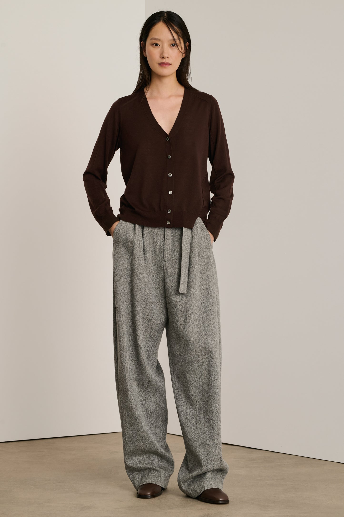 ALYSSA is a relaxed cardigan with a wide V-neckline. It is knitted in extra-fine merino wool to be worn directly on the skin. Asymmetry at the hem, decreases, ribbed trims and inside-out seams are details that add charm to this deceptively classic cardigan.