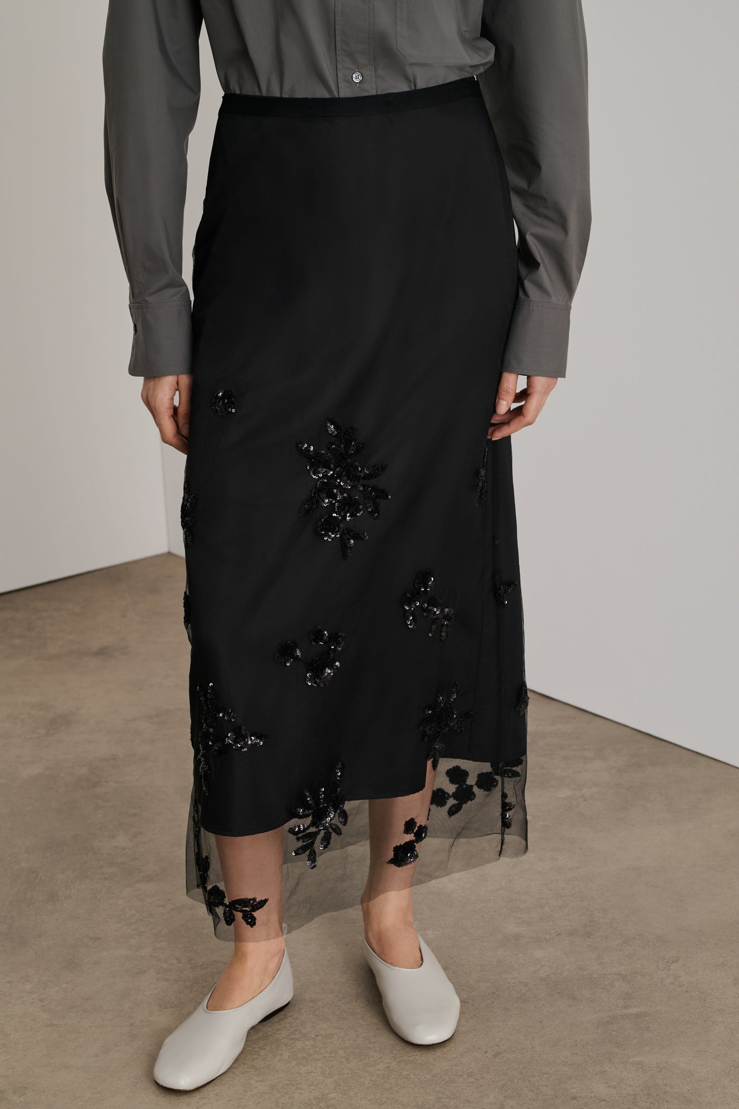 GRACE is an elegant long skirt in tulle and embroidery appliqués. Made in two parts: a lining underskirt to limit transparency, and a black tulle skirt over-embroidered with black sequined floral elements from bottom to top. It fastens with two invisible zips. Versatile, this skirt can be worn with or without its petticoat, depending on how daring you are.