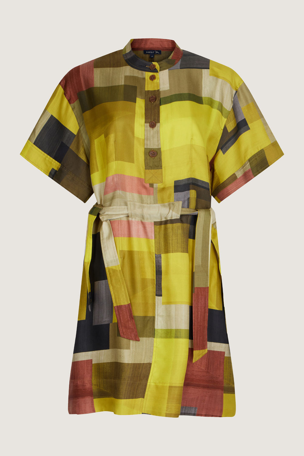 Printed silk twill minidress yellow/khaki